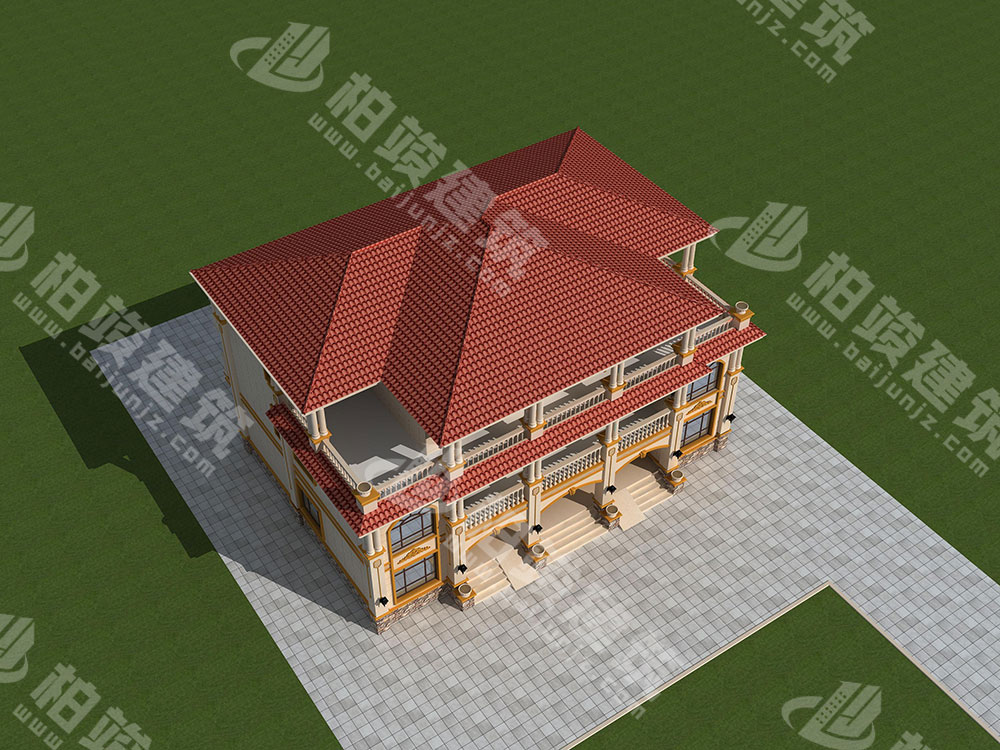 屋顶造型:坡屋顶设计,多个立面高低起伏,错落有致;红色釉面瓷瓦色泽鲜丽,经久耐用